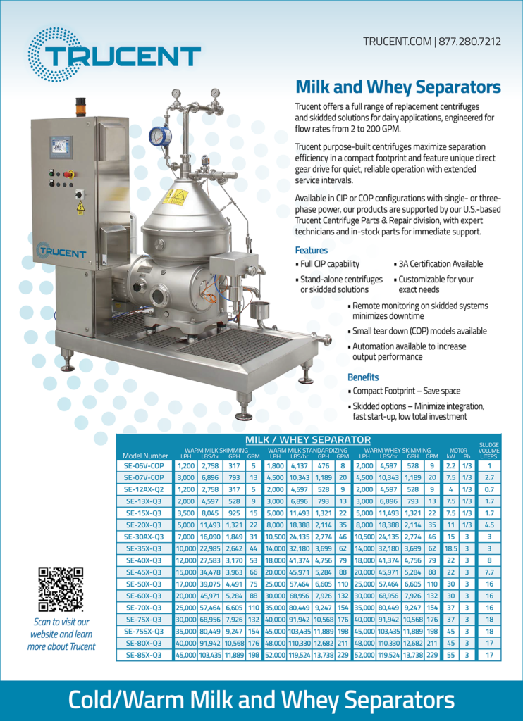 With decades of expertise in dairy centrifuge technology, Trucent delivers purpose-built dairy separators designed for efficiency, reliability, and product quality. Whether you need cold milk separation, whey clarification, bacteria removal,