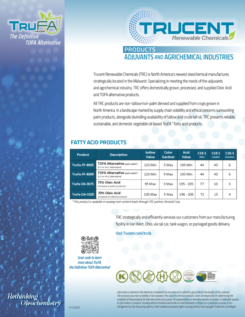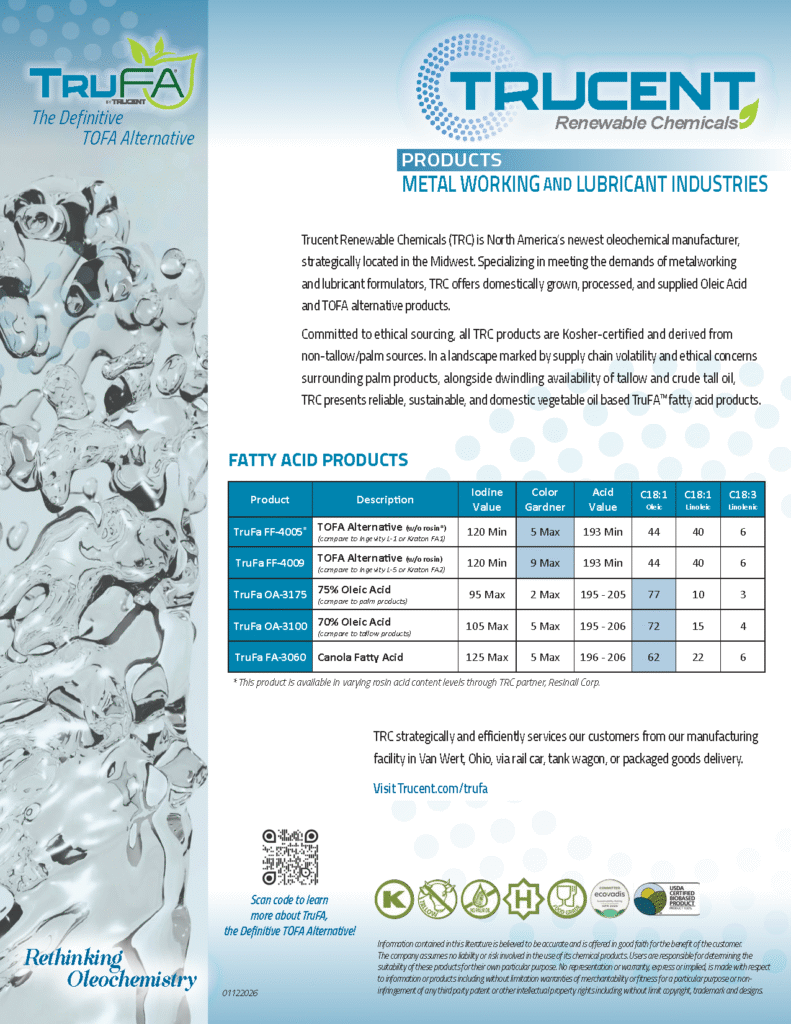 Using Trucent’s proprietary biocatalytic splitting technology, TruFA surpasses TOFA with unique benefits such as a low carbon footprint, plant-based seed oil sourcing, and a resilient supply chain. By isolating seed and vegetable oil triglycerides into essential fatty acids — stearate, oleate, and linoleate — TruFA exceeds industry standards.